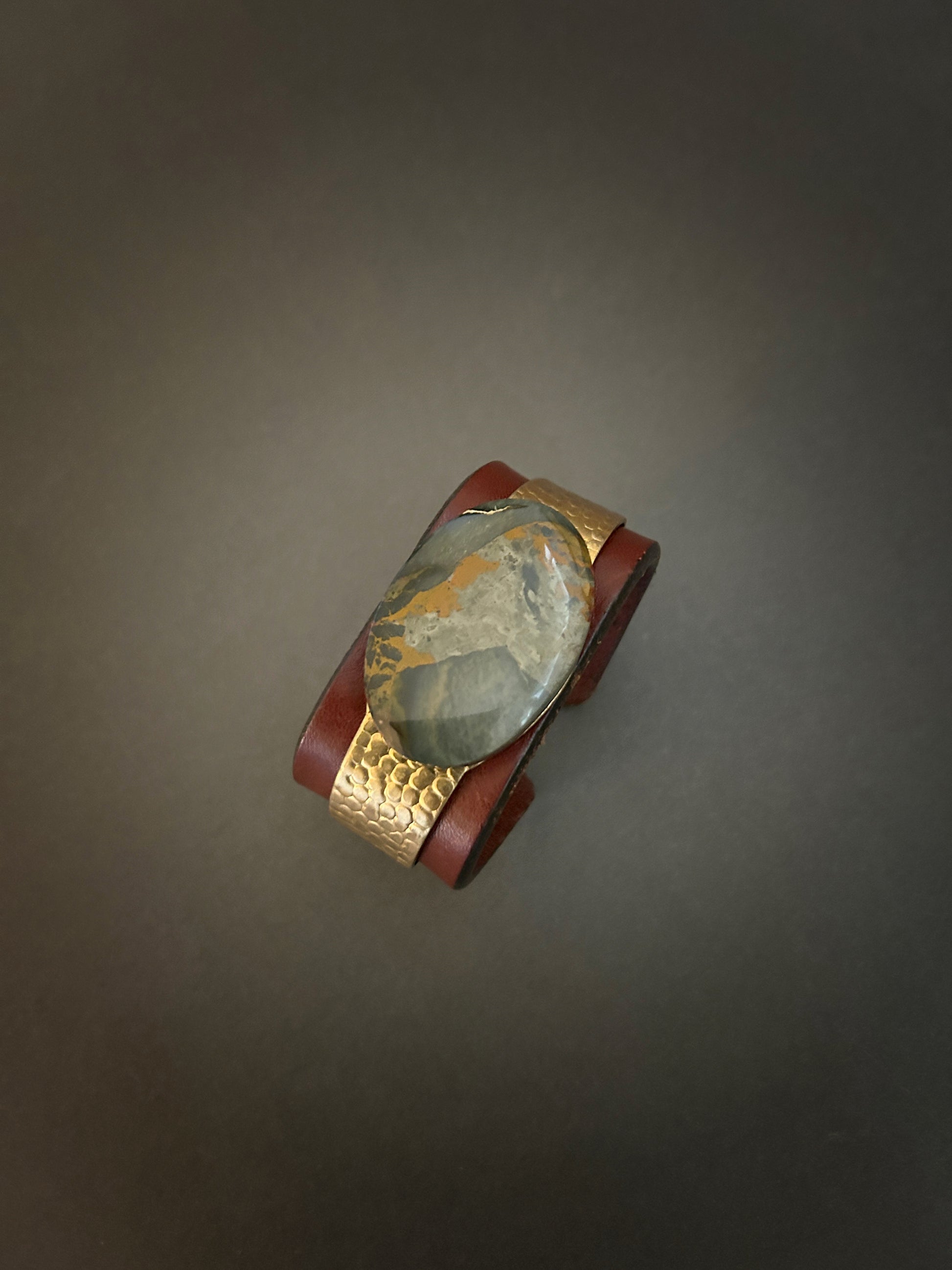 The "Not Quite Tame" leather and brass cuff. Textured natural brass and rustic vintage brown leather with a large oval Blue Mountain jasper cabochon. Measures about 1.3 inches wide and fits a 6.25 inch wrist. 240.