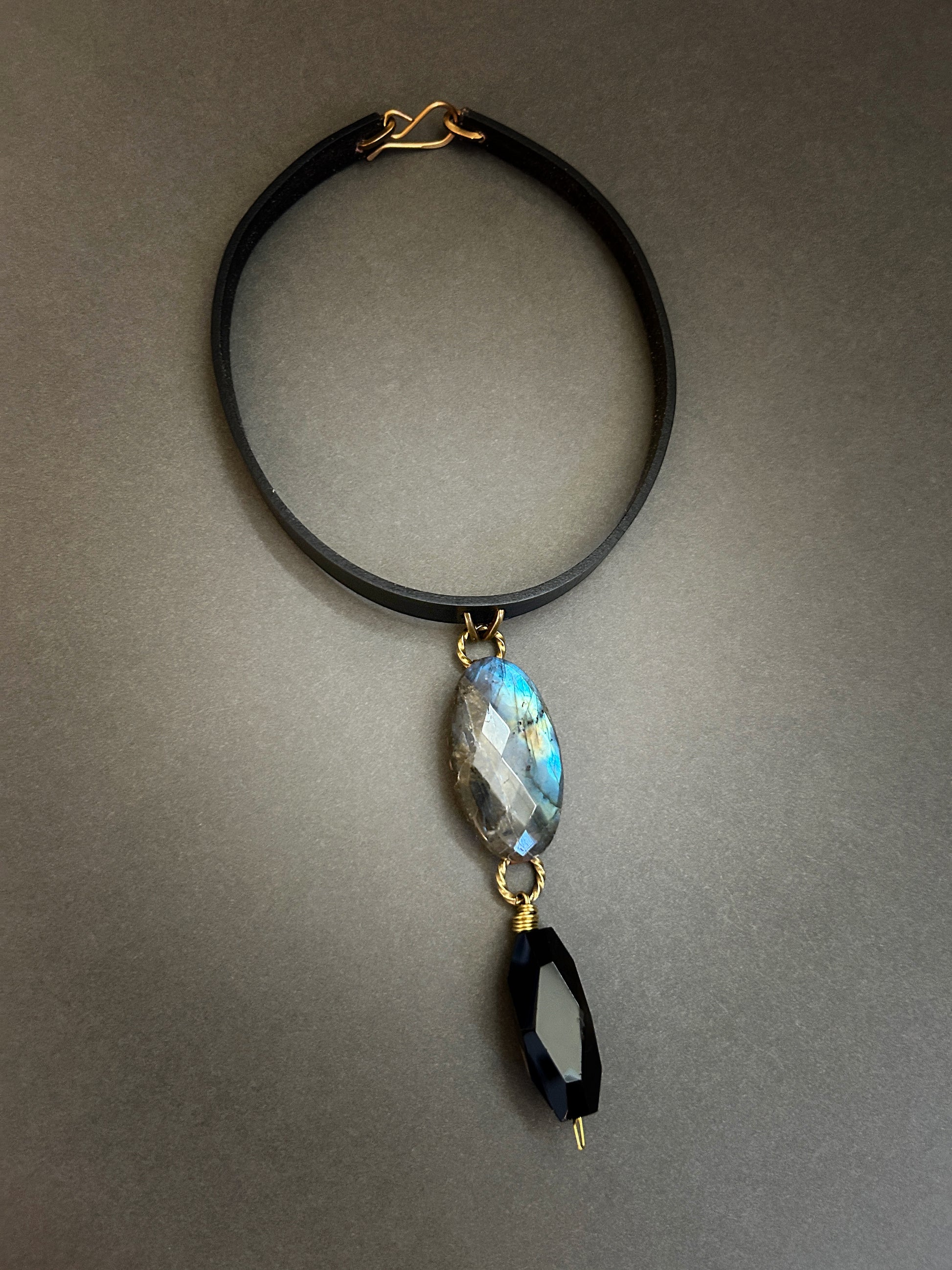 The Blackjack necklace. A luminous, flashy blue rose-cut labradorite cabochon, mounted on solid copper and finished with a chunky drop of faceted black agate. On black vegetable tan leather that measures about 16 inches around. Brass hook closure. 325.