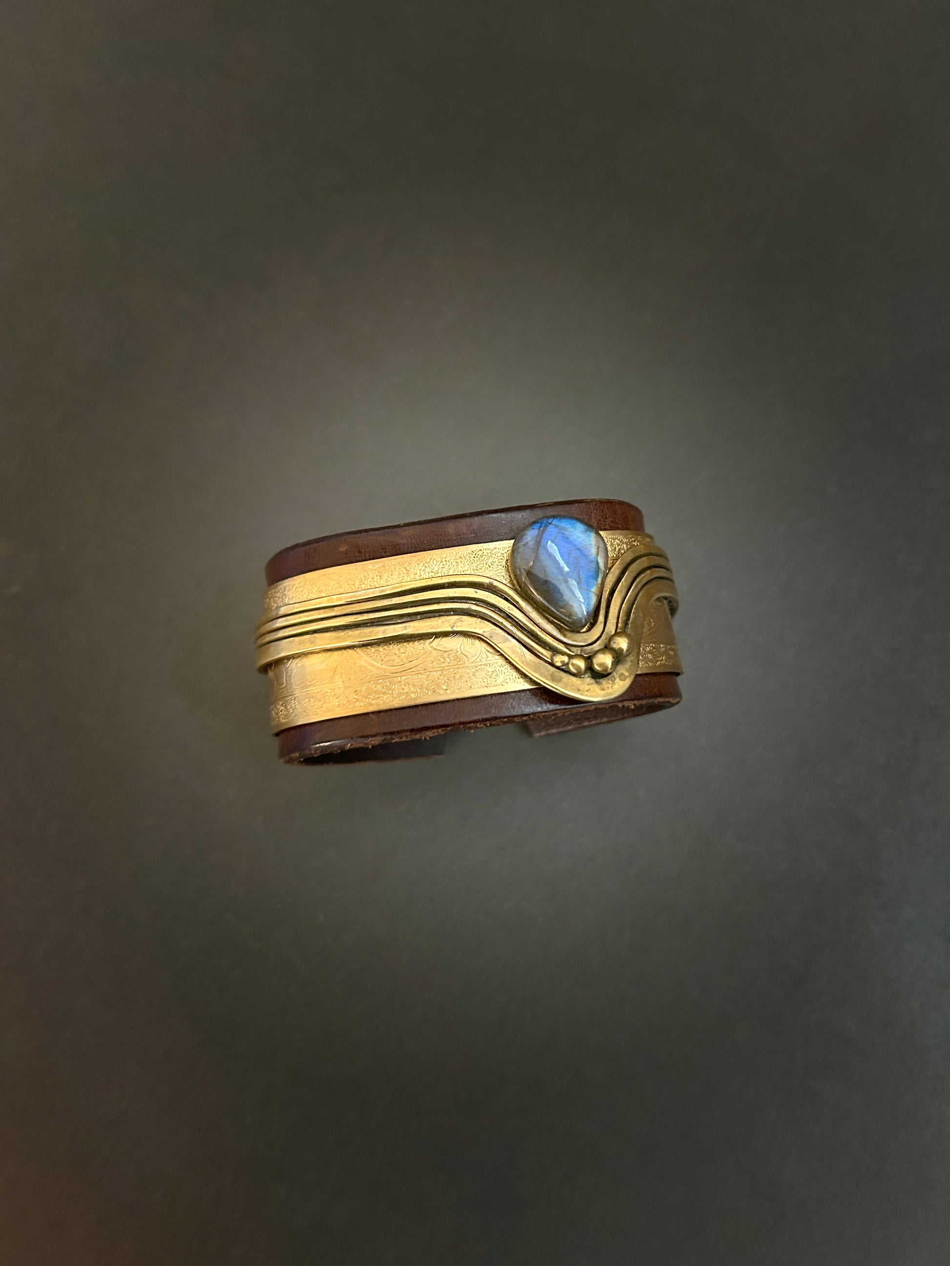 The Cimabue cuff in brass and leather. A luminous teardrop of blue labradorite nestles within a lyrical overlay of brass, layered on vintage rustic brown leather. About 1.5 inches wide, and fits a 6.5 to 6.75 inch wrist.